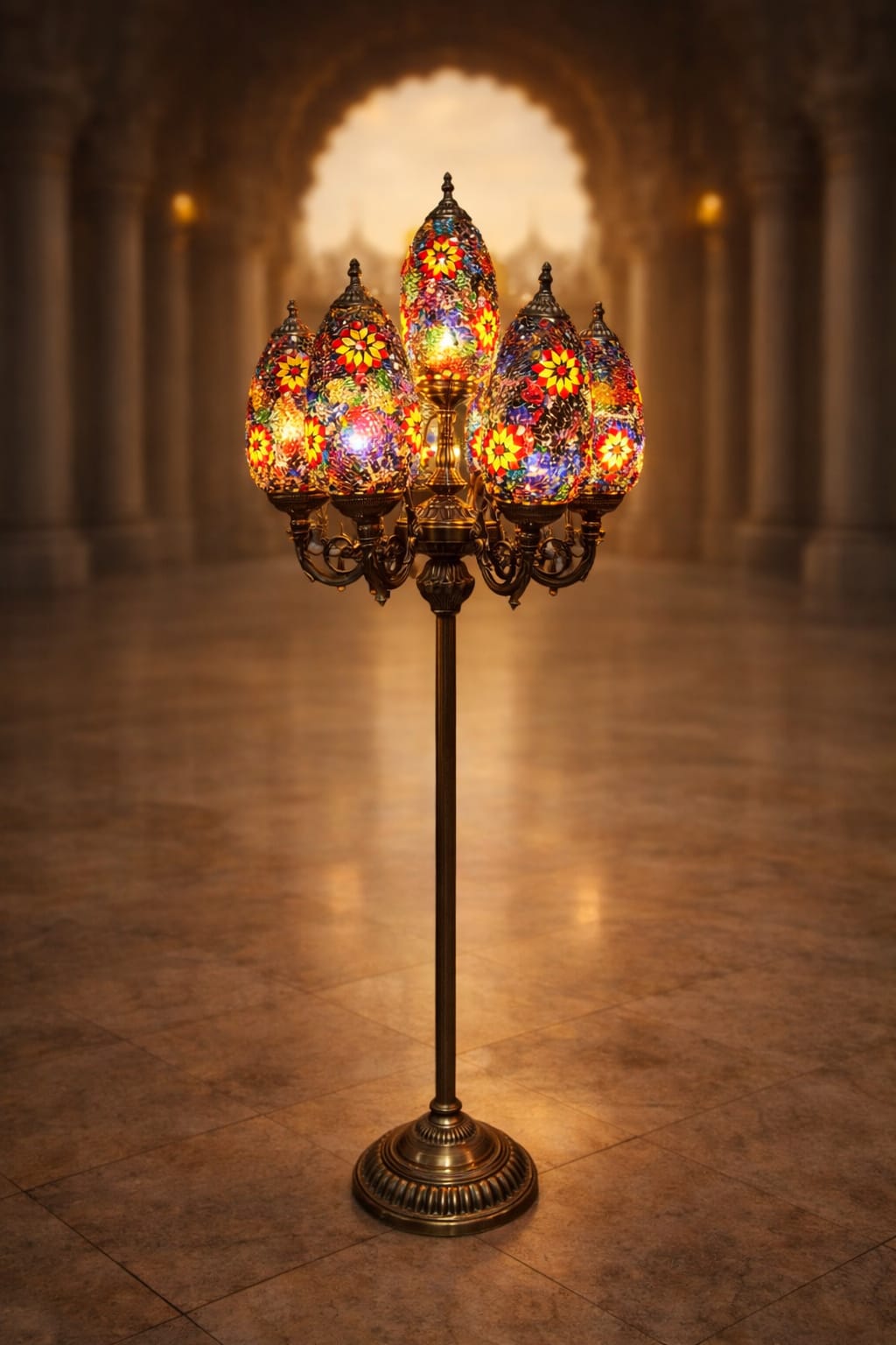 Lampara turca de pie, alta de 7 luces de 53cm X 53cm X 162cm.